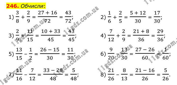 Обчисли: 1) 3/8 + 2/9 = (27 + 16)/72 = 43/72; 2) 1/6 + 2/5 = (5 + 12)/30 = 17/30; 3) 2/9 + 11/15 = (10 + 33)/45 = 43/45; 4) 7/12 + 2/9 = (21 + 8)/36 = 29/36; 5) 13/15 – 1/2 = (26 - 15)/30 = 11/30; 6) 9/20 – 13/30 = (27 - 26)/60 = 1/60; 7) 11/16 – 7/12 = (33 - 28)/48 = 5/48; 8) 21/26 – 8/13 = (21 - 16)/26 = 5/26.