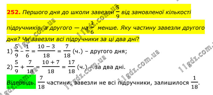 Першого дня до школи завезли 5/9 від замовленої кількості підручників, а другого — на 1/6 менше. Яку частину завезли другого дня? Чи завезли всі підручники за ці два дні? 1) 5/9 – 1/6 = (10 - 3)/18 = 7/18 (ч.) – другого дня; 2) 5/9 + 7/18 = (10 + 7)/18 = 17/18 (ч.) – за два дні. Відповідь. 7/18 частини; завезли не всі підручники, залишилося 1/18.