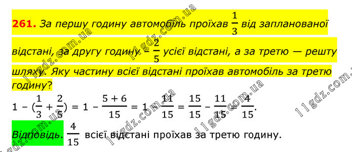 За першу годину автомобіль проїхав 1/3 від запланованoї відстані, за другу годину – 2/5 усієї відстані, а за третю — решту шляху. Яку частину всієї відстані проїхав автомобіль за третю годину? 1 – (1/3 + 2/5) = 1 – (5 + 6)/15 = 1 – 11/15 = 15/15 – 11/15 = 4/15. Відповідь. 4/15 всієї відстані проїхав за третю годину.