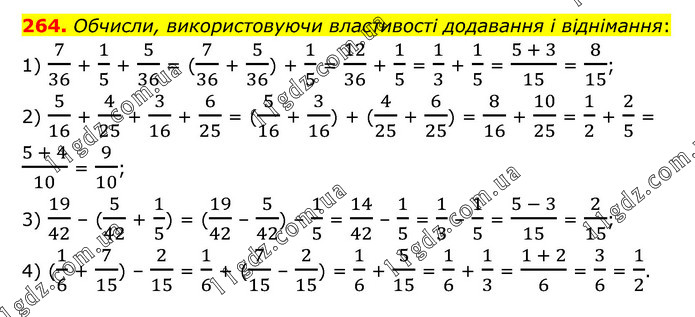 Обчисли, використовуючи властивості додавання і віднімання: 1) 7/36 + 1/5 + 5/36 = (7/36 + 5/36) + 1/5 = 12/36 + 1/5 = 1/3 + 1/5 = (5 + 3)/15 = 8/15; 2) 5/16 + 4/25 + 3/16 + 6/25 = (5/16 + 3/16) + (4/25 + 6/25) = 8/16 + 10/25 = 1/2 + 2/5 = (5 + 4)/10 = 9/10; 3) 19/42 – (5/42 + 1/5) = (19/42 – 5/42) – 1/5 = 14/42 – 1/5 = 1/3 – 1/5 = (5 - 3)/15 = 2/15; 4) (1/6 + 7/15) – 2/15 = 1/6 + (7/15 – 2/15) = 1/6 + 5/15 = 1/6 + 1/3 = (1 + 2)/6 = 3/6 = 1/2.
