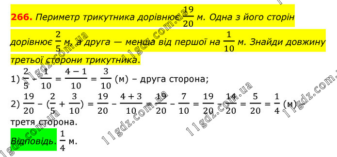 Периметр трикутника дорівнює 19/20 м. Одна з його сторін дорівнює 2/5 м, а друга — менша від першої на 1/10 м. Знайди довжину третьої сторони трикутника. 1) 2/5 – 1/10 = (4 - 1)/10 = 3/10 (м) – друга сторона; 2) 19/20 – (2/5 + 3/10) = 19/20 – (4 + 3)/10 = 19/20 – 7/10 = 19/20 – 14/20 = 5/20 = 1/4 (м) – третя сторона. Відповідь. 1/4 м.
