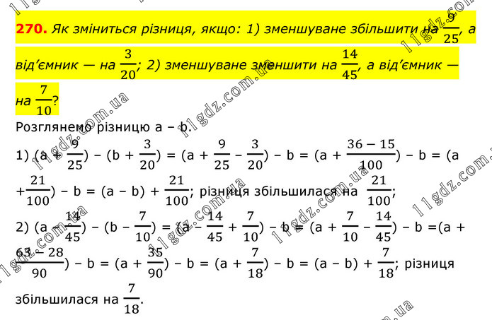 Як зміниться різниця, якщо: 1) зменшуване збільшити на 9/25, а від’ємник — на 3/20; 2) зменшуване зменшити на 14/45, а від’ємник — на 7/10? Розглянемо різницю a – b. 1) (a + 9/25) – (b + 3/20) = (a + 9/25 – 3/20) – b = (a + (36 - 15)/100) – b = (a +21/100) – b = (a – b) + 21/100; різниця збільшилася на 21/100; 2) (а – 14/45) – (b – 7/10) = (a – 14/45 + 7/10) – b = (a + 7/10 – 14/45) – b =(a + (63 - 28)/90) – b = (a + 35/90) – b = (a + 7/18) – b = (a – b) + 7/18; різниця збільшилася на 7/18.