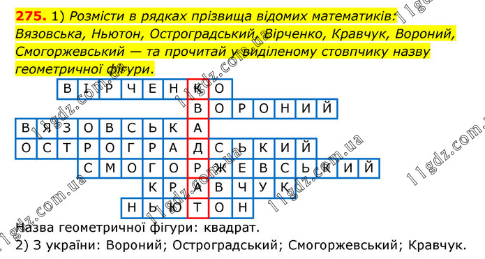 1) Розмісти в рядках прізвища відомих математиків: Вязовська, Ньютон, Остроградський, Вірченко, Кравчук, Вороний, Смогоржевський — та прочитай у виділеному стовпчику назву геометричної фігури. Назва геометричної фігури: квадрат. 2) З україни: Вороний; Остроградський; Смогоржевський; Кравчук.