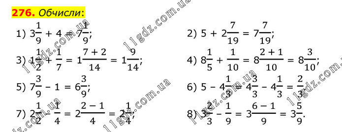 Обчисли: 1) 31/9 + 4 = 71/9; 2) 5 + 27/19 = 77/19; 3) 11/2 + 1/7 = 1(7 + 2)/14 = 19/14; 4) 81/5 + 1/10 = 8(2 + 1)/10 = 83/10; 5) 73/9 – 1 = 63/9; 6) 5 – 41/3 = 43/3 – 41/3 = 2/3. 7) 21/2 – 1/4 = 2(2 - 1)/4 = 21/4; 8) 32/3 – 1/9 = 3(6 - 1)/9 = 35/9.