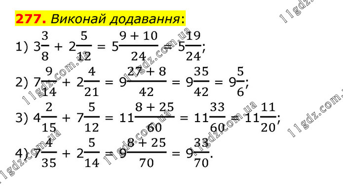 Виконай додавання: 1) 33/8 + 25/12 = 5(9 + 10)/24 = 519/24; 2) 79/14 + 24/21 = 9(27 + 8)/42 = 935/42 = 95/6; 3) 42/15 + 75/12 = 11(8 + 25)/60 = 1133/60 = 1111/20; 4) 74/35 + 25/14 = 9(8 + 25)/70 = 933/70.