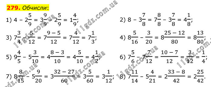 Обчисли: 1) 4 – 25/9 = 39/9 – 25/9 = 14/9; 2) 8 – 37/8 = 78/8 – 37/8 = 41/8; 3) 73/4 – 5/12 = 7(9 - 5)/12 = 74/12 = 71/3; 4) 85/16 – 3/20 = 8(25 - 12)/80 = 813/80; 5) 94/5 – 53/10 = 4(8 - 3)/10 = 45/10 = 41/2; 6) 75/6 – 77/12 = (10 - 7)/12 = 3/12 = 1/4; 7) 88/15 – 59/20 = 3(32 - 27)/60 = 35/60 = 31/12; 8) 711/14 – 54/21 = 2(33 - 8)/42 = 225/42.
