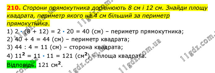 Сторони прямокутника дорівнюють 8 см і 12 см. Знайди площу квадрата, периметр якого на 4 см більший за периметр прямокутника. 1) 2 · (8 + 12) = 2 · 20 = 40 (см) – периметр прямокутника; 2) 40 + 4 = 44 (см) – периметр квадрата; 3) 44 : 4 = 11 (см) – сторона квадрата; 4) 112 = 11 · 11 = 121 (см2) – площа квадрата. Відповідь. 121 см2.