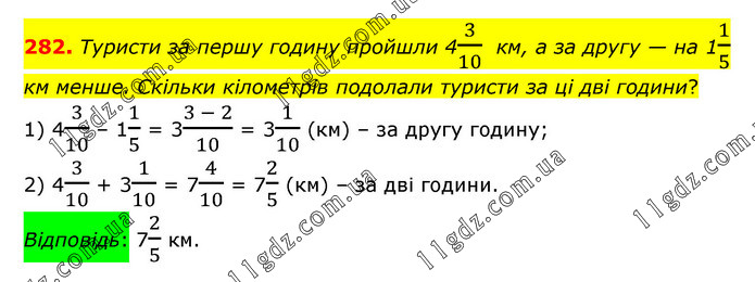 Туристи за першу годину пройшли 43/10 км, а за другу — на 11/5 км менше. Скільки кілометрів подолали туристи за ці дві години? 1) 43/10 – 11/5 = 3(3 - 2)/10 = 31/10 (км) – за другу годину; 2) 43/10 + 31/10 = 74/10 = 72/5 (км) – за дві години. Відповідь: 72/5 км.