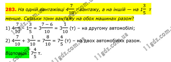 На одній вантажівці 47/10 т вантажу, а на іншій — на 13/5 т менше. Скільки тонн вантажу на обох машинах разом? 1) 47/10 – 13/5 = 3(7 - 6)/10 = 31/10 (т) – на другому автомобілі; 2) 47/10 + 31/10 = 78/10 = 74/5 (т) – на двох автомобілях разом. Відповідь: 74/5 т.