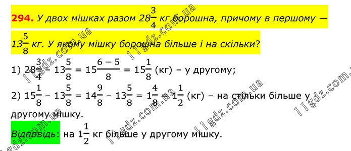 У двох мішках разом 283/4 кг борошна, причому в першому — 135/8 кг. У якому мішку борошна більше і на скільки? 1) 283/4 – 135/8 = 15(6 - 5)/8 = 151/8 (кг) – у другому; 2) 151/8 – 135/8 = 149/8 – 135/8 = 14/8 = 11/2 (кг) – на стільки більше у другому мішку. Відповідь: на 11/2 кг більше у другому мішку.