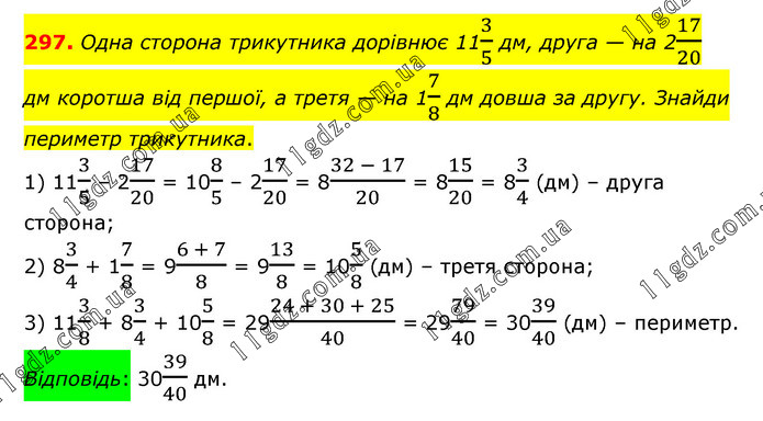 Одна сторона трикутника дорівнює 113/5 дм, друга — на 217/20 дм коротша від першої, а третя — на 17/8 дм довша за другу. Знайди периметр трикутника. 1) 113/5 – 217/20 = 108/5 – 217/20 = 8(32 - 17)/20 = 815/20 = 83/4 (дм) – друга сторона; 2) 83/4 + 17/8 = 9(6 + 7)/8 = 913/8 = 105/8 (дм) – третя сторона; 3) 113/8 + 83/4 + 105/8 = 29(24 + 30 + 25)/40 = 2979/40 = 3039/40 (дм) – периметр. Відповідь: 3039/40 дм.