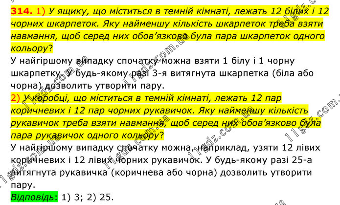 1) У ящику, що міститься в темній кімнаті, лежать 12 білих і 12 чорних шкарпеток. Яку найменшу кількість шкарпеток треба взяти навмання, щоб серед них обов’язково була пара шкарпеток одного кольору? У найгіршому випадку спочатку можна взяти 1 білу і 1 чорну шкарпетку. У будь-якому разі 3-я витягнута шкарпетка (біла або чорна) дозволить утворити пару. 2) У коробці, що міститься в темній кімнаті, лежать 12 пар коричневих і 12 пар чорних рукавичок. Яку найменшу кількість рукавичок треба взяти навмання, щоб серед них обов’язково була пара рукавичок одного кольору? У найгіршому випадку спочатку можна, наприклад, узяти 12 лівих коричневих і 12 лівих чорних рукавичок. У будь-якому разі 25-а витягнута рукавичка (коричнева або чорна) дозволить утворити пару. Відповідь: 1) 3; 2) 25.