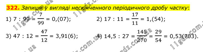 Запиши у вигляді нескінченного періодичного дробу частку: 1) 7 : 99 = 7/99 = 0,(07); 2) 17 : 11 = 17/11 = 1,(54); 3) 47 : 12 = 47/12 = 3,91(6); 4) 14,5 : 27 = 145/270 = 29/54 = 0,53(703).
