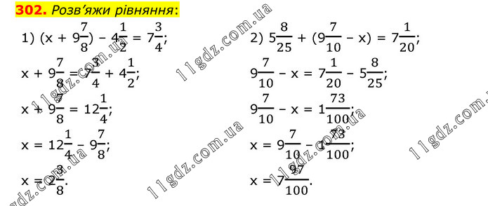Розв’яжи рівняння: 1) (х + 97/8) – 41/2 = 73/4; х + 97/8 = 73/4 + 41/2; х + 97/8 = 121/4; х = 121/4 – 97/8; х = 23/8. 2) 58/25 + (97/10 – х) = 71/20; 97/10 – х = 71/20 – 58/25; 97/10 – х = 173/100; х = 97/10 – 173/100; х = 797/100.