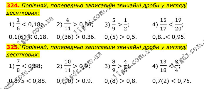 324. Порівняй, попередньо записавши звичайні дроби у вигляді десяткових: 1) 1/6 < 0,18; 2) 4/11 > 0,36; 3) 5/9 > 1/2; 4) 15/17 < 19/20; 0,1(6) < 0,18. 0,(36) > 0,36. 0,(5) > 0,5. 0,8…< 0,95. 325. Порівняй, попередньо записавши звичайні дроби у вигляді десяткових: 1) 7/8 < 0,88; 2) 10/11 > 0,9; 3) 8/9 > 4/5; 4) 13/18 < 3/4; 0,875 < 0,88. 0,(90) > 0,9. 0,(8) > 0,8. 0,7(2) < 0,75.