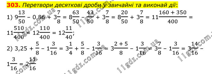 Перетвори десяткові дроби у звичайні та виконай дії: 1) 913/50 – 0,86 + 37/8 = 863/50 – 43/50 + 37/8 = 820/50 + 37/8 = 11(160 + 350)/400 = 11510/400 = 12110/400 = 1211/40; 2) 3,25 + 5/8 – 13/16 = 31/4 + 5/8 – 13/16 = 3(2 + 5)/8 – 13/16 = 37/8 – 13/16 = 314/16 – 13/16 = 211/16