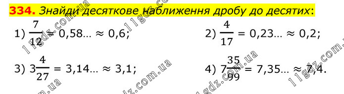 Знайди десяткове наближення дробу до десятих: 1) 7/12 = 0,58… ≈ 0,6; 2) 4/17 = 0,23… ≈ 0,2; 3) 34/27 = 3,14… ≈ 3,1; 4) 735/99 = 7,35… ≈ 7,4.