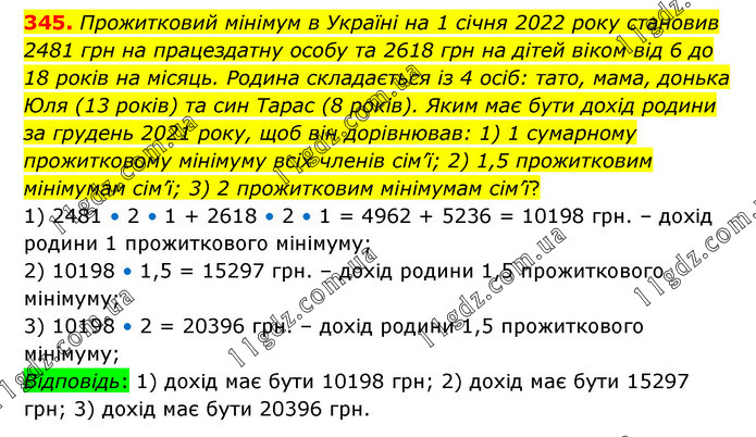Прожитковий мінімум в Україні на 1 січня 2022 року становив 2481 грн на працездатну особу та 2618 грн на дітей віком від 6 до 18 років на місяць. Родина складається із 4 осіб: тато, мама, донька Юля (13 років) та син Тарас (8 років). Яким має бути дохід родини за грудень 2021 року, щоб він дорівнював: 1) 1 сумарному прожитковому мінімуму всіх членів сім’ї; 2) 1,5 прожитковим мінімумам сім’ї; 3) 2 прожитковим мінімумам сім’ї? 1) 2481 • 2 • 1 + 2618 • 2 • 1 = 4962 + 5236 = 10198 грн. – дохід родини 1 прожиткового мінімуму; 2) 10198 • 1,5 = 15297 грн. – дохід родини 1,5 прожиткового мінімуму; 3) 10198 • 2 = 20396 грн. – дохід родини 1,5 прожиткового мінімуму; Відповідь: 1) дохід має бути 10198 грн; 2) дохід має бути 15297 грн; 3) дохід має бути 20396 грн.