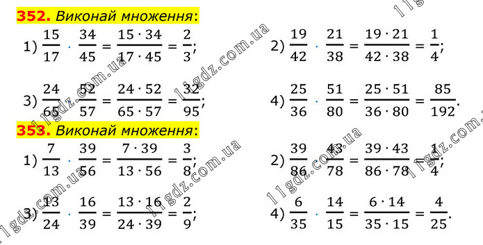 352. Виконай множення: 1) 15/17 · 34/45 = (15 ∙ 34)/(17 ∙ 45) = 2/3; 2) 19/42 · 21/38 = (19 ∙ 21)/(42 ∙ 38) = 1/4; 3) 24/65 · 52/57 = (24 ∙ 52)/(65 ∙ 57) = 32/95; 4) 25/36 · 51/80 = (25 ∙ 51)/(36 ∙ 80) = 85/192. 353. Виконай множення: 1) 7/13 · 39/56 = (7 ∙ 39)/(13 ∙ 56) = 3/8; 2) 39/86 · 43/78 = (39 ∙ 43)/(86 ∙ 78) = 1/4; 3) 13/24 · 16/39 = (13 ∙ 16)/(24 ∙ 39) = 2/9; 4) 6/35 · 14/15 = (6 ∙ 14)/(35 ∙ 15) = 4/25.