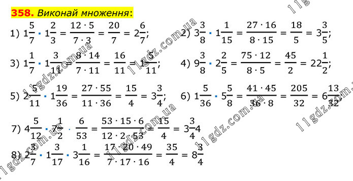 Виконай множення: 1) 15/7 · 12/3 = (12 ∙ 5)/(7 ∙ 3) = 20/7 = 26/7; 2) 33/8 · 11/15 = (27 ∙ 16)/(8 ∙ 15) = 18/5 = 33/5; 3) 11/7 · 13/11 = (8 ∙ 14)/(7 ∙ 11) = 16/11 = 15/11; 4) 93/8 · 22/5 = (75 ∙ 12)/(8 ∙ 5) = 45/2 = 221/2; 5) 25/11 · 119/36 = (27 ∙ 55)/(11 ∙ 36) = 15/4 = 33/4; 6) 15/36 · 55/8 = (41 ∙ 45)/(36 ∙ 8) = 205/32 = 613/32; 7) 45/12 · 71/2 · 6/53 = (53 ∙ 15 ∙ 6)/(12 ∙ 2 ∙ 53) = 15/4 = 33/44 8) 23/7 · 13/17 · 31/16 = (17 ∙ 20 ∙ 49)/(7 ∙ 17 ∙ 16) = 35/4 = 83/4