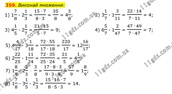 Виконай множення: 1) 17/8 · 21/3 = (15 ∙ 7)/(8 ∙ 3) = 35/8 = 43/8; 2) 31/7 · 13/11 = (22 ∙ 14)/(7 ∙ 11) = 4; 3) 41/5 · 21/7 = (21 ∙ 15)/(5 ∙ 7) = 9; 4) 65/7 · 12/47 = (47 ∙ 49)/(7 ∙ 47) = 7; 5) 44/17 · 31/18 = (72 ∙ 55)/(17 ∙ 18) = 220/17 = 1216/17; 6) 222/25 · 111/24 = (72 ∙ 35)/(25 ∙ 24) = 21/5 = 41/5; 7) 18/9 · 22/3 · 3/8 = (17 ∙ 8 ∙ 3)/(9 ∙ 3 ∙ 8) = 17/9 = 18/9; 8) 17/8 · 31/5 · 21/3 = (15 ∙ 16 ∙ 7)/(8 ∙ 5 ∙ 3) = 14.