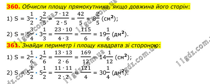 360. Обчисли площу прямокутника, якщо довжина його сторін: 1) S = 31/2 · 22/5 = (7 ∙ 12)/(2 ∙ 5) = 42/5 = 82/5 (см2); 2) S = 53/4 · 31/3 = (23 ∙ 10)/(4 ∙ 3) = 115/6 = 191/6 (дм2). 361. Знайди периметр і площу квадрата зі стороною: 1) S = 21/6 · 21/6 = (13 ∙ 13)/(2 ∙ 6) = 169/12 = 141/12 (см2); 2) S = 51/2 · 51/2 = (11 ∙ 11)/(2 ∙ 2) = 121/4 = 301/4 (дм2).