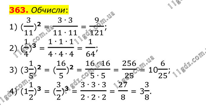 Обчисли: 1) (3/11)2 = (3 ∙ 3)/(11 ∙ 11) = 9/121; 2) (1/4)3 = (1 ∙ 1 ∙ 1)/(4 ∙ 4 ∙ 4) = 1/64; 3) (31/5)2 = (16/5)2 = (16 ∙ 16)/(5 ∙ 5) = 256/25 = 106/25; 4) (11/2)3 = (3/2)3 = (3 ∙ 3 ∙ 3)/(2 ∙ 2 ∙ 2) = 27/8 = 33/8.