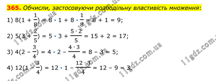 Обчисли, застосовуючи розподільну властивість множення: 1) 8(1 + 1/8) = 8 · 1 + 8 · 1/8 = 8 + 1 = 9; 2) 5(3 + 2/5) = 5 · 3 + (5 ∙ 2)/5 = 15 + 2 = 17; 3) 4(2 – 3/4) = 4 · 2 – (4 ∙ 3)/4 = 8 – 3 = 5; 4) 12(1 – 3/4) = 12 · 1 – (12 ∙ 3)/4 = 12 – 9 = 3.