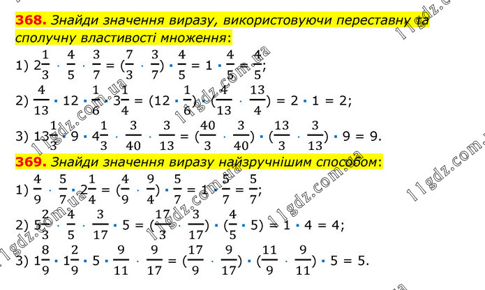 368. Знайди значення виразу, використовуючи переставну та сполучну властивості множення: 1) 21/3 · 4/5 · 3/7 = (7/3 · 3/7) · 4/5 = 1 · 4/5 = 4/5; 2) 4/13 · 12 · 1/6 · 31/4 = (12 · 1/6) · (4/13 · 13/4) = 2 · 1 = 2; 3) 131/3 · 9 · 41/3 · 3/40 · 3/13 = (40/3 · 3/40) · (13/3 · 3/13) · 9 = 9. 369. Знайди значення виразу найзручнішим способом: 1) 4/9 · 5/7 · 21/4 = (4/9 · 9/4) · 5/7 = 1 · 5/7 = 5/7; 2) 52/3 · 4/5 · 3/17 · 5 = (17/3 · 3/17) · (4/5 · 5) = 1 · 4 = 4; 3) 18/9 · 12/9 · 5 · 9/11 · 9/17 = (17/9 · 9/17) · (11/9 · 9/11) · 5 = 5.