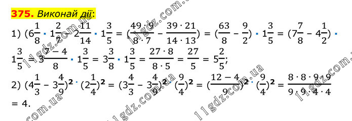 Виконай дії: 1) (61/8 · 12/7 – 211/14 · 13/5 = ((49 ∙ 9)/(8 ∙ 7) – (39 ∙ 21)/(14 ∙ 13)) = (63/8 – 9/2) · 13/5 = (77/8 – 41/2) · 13/5 = 3(7 - 4)/8 · 13/5 = 33/8 · 13/5 = (27 ∙ 8)/(8 ∙ 5) = 27/5 = 52/5; 2) (41/3 – 34/9)2 · (21/4)2 = (34/3 – 34/9)2 · (9/4)2 = ((12 - 4)/9)2 · (9/4)2 = (8 ∙ 8 ∙ 9 ∙ 9)/(9 ∙ 9 ∙ 4 ∙ 4) = 4.