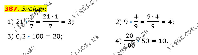 Знайди: 1) 21 · 1/7 = (21 ∙ 1)/7 = 3; 2) 9 · 4/9 = (9 ∙ 4)/9 = 4; 3) 0,2 · 100 = 20; 4) 20/100 · 50 = 10.