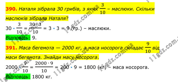 390. Наталя зібрала З0 грибів, з яких 3/10 – маслюки. Скільки маслюків зібрала Наталя? 30 · 3/10 = (30 ∙ 3)/10 = 3 · 3 = 9 (гр.) – маслюки. Відповідь: 9. 391. Маса бегемота — 2000 кг, а маса носорога складає 9/10 від маси бегемота. Знайди масу носорога. 2000 · 9/10 = (2000 ∙ 9)/10 = 200 · 9 = 1800 (кг) – маса носорога. Відповідь: 1800 кг.
