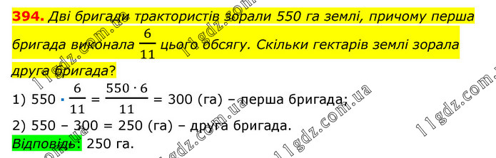 Дві бригади трактористів зорали 550 га землі, причому перша бригада виконала 6/11 цього обсягу. Скільки гектарів землі зорала друга бригада? 1) 550 · 6/11 = (550 ∙ 6)/11 = 300 (га) – перша бригада; 2) 550 – 300 = 250 (га) – друга бригада. Відповідь: 250 га.
