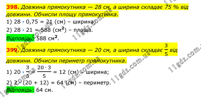 398. Довжина прямокутника — 28 см, а ширина складає 75 % від довжини. Обчисли площу прямокутника. 1) 28 · 0,75 = 21 (см) – ширина; 2) 28 · 21 = 588 (см2) – площа. Відповідь: 588 см2. 399. Довжина прямокутника — 20 см, а ширина складає 3/5 від довжини. Обчисли периметр прямокутника. 1) 20 · 3/5 = (20 ∙ 3)/5 = 12 (см) – ширина; 2) 2 · (20 + 12) = 64 (см) – периметр. Відповідь: 64 см.