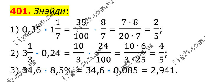 Знайди: 1) 0,35 · 11/7 = 35/100 · 8/7 = (7 ∙ 8)/(20 ∙ 7) = 2/5; 2) 31/3 · 0,24 = 10/3 · 24/100 = (10 ∙ 6)/(3 ∙ 25) = 4/5; 3) 34,6 · 8,5% = 34,6 · 0,085 = 2,941.