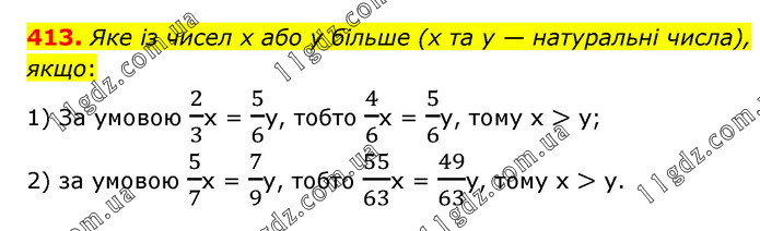 Яке із чисел х або у більше (х та у — натуральні числа), якщо: 1) За умовою 2/3х = 5/6у, тобто 4/6х = 5/6у, тому х > у; 2) за умовою 5/7х = 7/9у, тобто 55/63х = 49/63у, тому х > у.