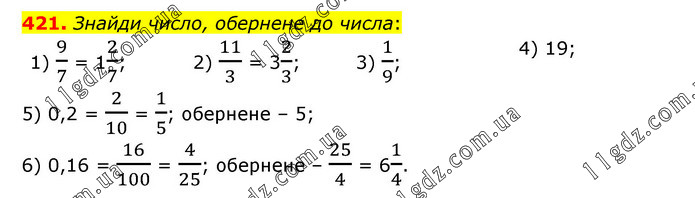 Знайди число, обернене до числа: 1) 9/7 = 12/7; 2) 11/3 = 32/3; 3) 1/9; 4) 19; 5) 0,2 = 2/10 = 1/5; обернене – 5; 6) 0,16 = 16/100 = 4/25; обернене – 25/4 = 61/4.