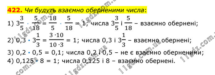 Чи будуть взаємно оберненими числа: 1) 33/5 · 5/18 = 18/5 · 5/18 = 1; числа 33/5 і 5/18 – взаємно обернені; 2) 0,3 · 31/3 = (3 ∙10)/(10 ∙3) = 1; числа 0,3 і 31/3 – взаємно обернені; 3) 0,2 · 0,5 = 0,1; числа 0,2 і 0,5 – не є взаємно оберненими; 4) 0,125 · 8 = 1; числа 0,125 і 8 – взаємно обернені.