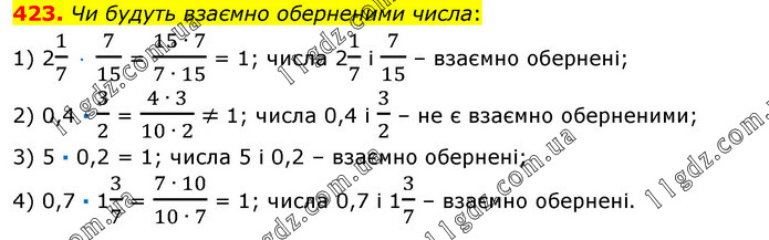 Чи будуть взаємно оберненими числа: 1) 21/7 · 7/15 = (15 ∙ 7)/(7 ∙ 15) = 1; числа 21/7 і 7/15 – взаємно обернені; 2) 0,4 · 3/2 = (4 ∙ 3)/(10 ∙ 2) ≠ 1; числа 0,4 і 3/2 – не є взаємно оберненими; 3) 5 · 0,2 = 1; числа 5 і 0,2 – взаємно обернені; 4) 0,7 · 13/7 = (7 ∙ 10)/(10 ∙ 7) = 1; числа 0,7 і 13/7 – взаємно обернені.