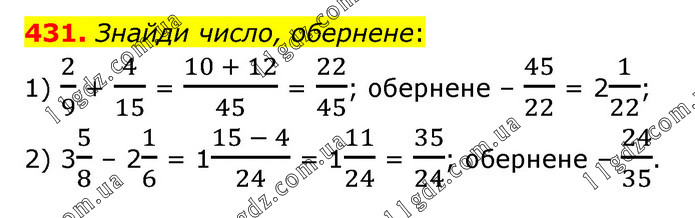 Знайди число, обернене: 1) 2/9 + 4/15 = (10 + 12)/45 = 22/45; обернене – 45/22 = 21/22; 2) 35/8 – 21/6 = 1(15 - 4)/24 = 111/24 = 35/24; обернене – 24/35.