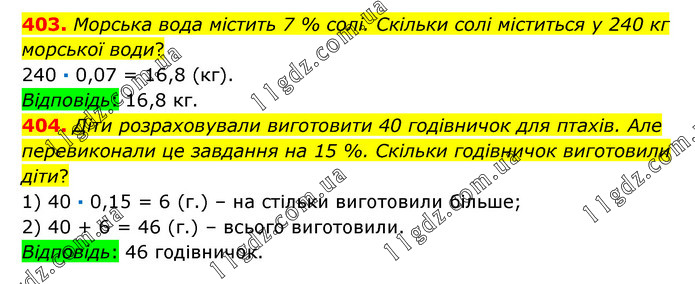 403. Морська вода містить 7 % солі. Скільки солі міститься у 240 кг морської води? 240 · 0,07 = 16,8 (кг). Відповідь: 16,8 кг. 404. Діти розраховували виготовити 40 годівничок для птахів. Але перевиконали це завдання на 15 %. Скільки годівничок виготовили діти? 1) 40 · 0,15 = 6 (г.) – на стільки виготовили більше; 2) 40 + 6 = 46 (г.) – всього виготовили. Відповідь: 46 годівничок.