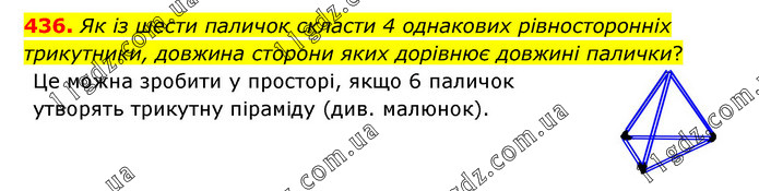 Як із шести паличок скласти 4 однакових рівносторонніх трикутники, довжина сторони яких дорівнює довжині палички? Це можна зробити у просторі, якщо 6 паличок утворять трикутну піраміду (див. малюнок).