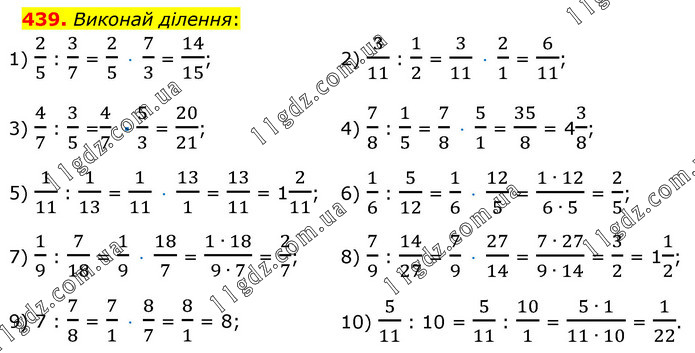Виконай ділення: 1) 2/5 : 3/7 = 2/5 · 7/3 = 14/15; 2) 3/11 : 1/2 = 3/11 · 2/1 = 6/11; 3) 4/7 : 3/5 =4/7 · 5/3 = 20/21; 4) 7/8 : 1/5 = 7/8 · 5/1 = 35/8 = 43/8; 5) 1/11 : 1/13 = 1/11 · 13/1 = 13/11 = 12/11; 6) 1/6 : 5/12 = 1/6 · 12/5 = (1 ∙ 12)/(6 ∙ 5) = 2/5; 7) 1/9 : 7/18 = 1/9 · 18/7 = (1 ∙ 18)/(9 ∙ 7) = 2/7; 8) 7/9 : 14/27 = 7/9 · 27/14 = (7 ∙ 27)/(9 ∙ 14) = 3/2 = 11/2; 9) 7 : 7/8 = 7/1 · 8/7 = 8/1 = 8; 10) 5/11 : 10 = 5/11 : 10/1 = (5 ∙ 1)/(11 ∙ 10) = 1/22.