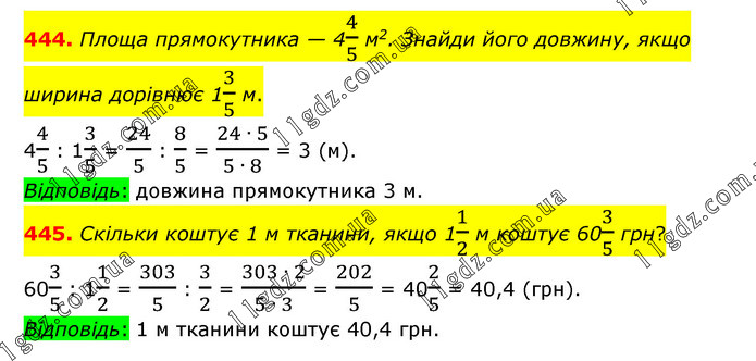 444. Площа прямокутника — 44/5 м2. Знайди його довжину, якщо ширина дорівнює 13/5 м. 44/5 : 13/5 = 24/5 : 8/5 = (24 ∙ 5)/(5 ∙ 8) = 3 (м). Відповідь: довжина прямокутника 3 м. 445. Скільки коштує 1 м тканини, якщо 11/2 м коштує 603/5 грн? 603/5 : 11/2 = 303/5 : 3/2 = (303 ∙ 2)/(5 ∙ 3) = 202/5 = 402/5 = 40,4 (грн). Відповідь: 1 м тканини коштує 40,4 грн.