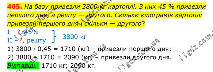 На базу привезли 3800 кг картоплі. З них 45 % привезли першого дня, а решту — другого. Скільки кілограмів картоплі привезли першого дня і скільки — другого? І - ?, 45% ІІ - ?, решту. 1) 3800 · 0,45 = 1710 (кг) – привезли першого дня; 2) 3800 – 1710 = 2090 (кг) – привезли другого дня. Відповідь: 1710 кг; 2090 кг.