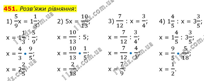 Розв’яжи рівняння: 1) 5/9х = 11/3; х = 11/3 : 5/9; х = 4/3 • 9/5; х = 22/5. 2) 5х = 10/13; х = 10/13 : 5; х = 10/13 • 1/5; х = 2/13. 3) 7/12 : х = 3/4; х = 7/12 : 3/4; х = 7/12 • 4/3; х = 7/9. 4) 14/5 : х = 33/5; х = 14/5 : 33/5; х = 9/5 • 5/18; х = 1/2.