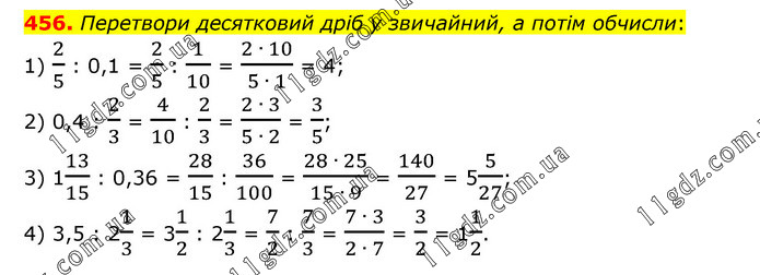 Перетвори десятковий дріб у звичайний, а потім обчисли: 1) 2/5 : 0,1 = 2/5 : 1/10 = (2 ∙ 10)/(5 ∙ 1) = 4; 2) 0,4 : 2/3 = 4/10 : 2/3 = (2 ∙ 3)/(5 ∙ 2) = 3/5; 3) 113/15 : 0,36 = 28/15 : 36/100 = (28 ∙ 25)/(15 ∙ 9) = 140/27 = 55/27; 4) 3,5 : 21/3 = 31/2 : 21/3 = 7/2 : 7/3 = (7 ∙ 3)/(2 ∙ 7) = 3/2 = 11/2.