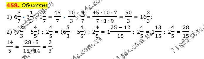 Обчисли: 1) 63/7 · 31/3 : 12/7 = 45/7 · 10/3 : 9/7 = (45 ∙ 10 ∙ 7)/(7 ∙ 3 ∙ 9) = 50/3 = 162/3; 2) (72/3 – 54/5) : 24/5 = (65/3 – 54/5) : 24/5 = 1(25 - 12)/15 : 24/5 = 113/15 : 24/5 = 28/15 : 14/5 = (28 ∙ 5)/(15 ∙ 14) = 2/3.
