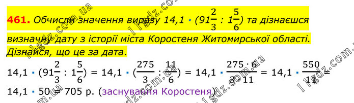 Обчисли значення виразу 14,1 · (912/3 : 15/6) та дізнаєшся визначну дату з історії міста Коростеня Житомирської області. Дізнайся, що це за дата. 14,1 · (912/3 : 15/6) = 14,1 · (275/3 : 11/6) = 14,1 · (275 ∙ 6)/(3 ∙ 11) = 14,1 · 550/11 = 14,1 · 50 = 705 р. (заснування Коростеня)