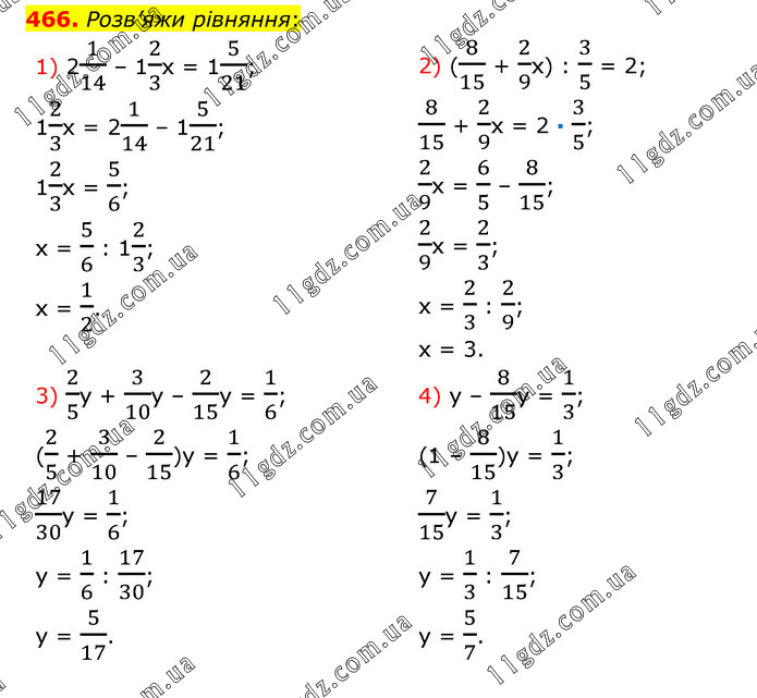 Розв’яжи рівняння: 1) 21/14 – 12/3х = 15/21; 12/3х = 21/14 – 15/21; 12/3х = 5/6; х = 5/6 : 12/3; х = 1/2. 2) (8/15 + 2/9х) : 3/5 = 2; 8/15 + 2/9х = 2 · 3/5; 2/9х = 6/5 – 8/15; 2/9х = 2/3; х = 2/3 : 2/9; х = 3. 3) 2/5у + 3/10у – 2/15у = 1/6; (2/5 + 3/10 – 2/15)у = 1/6; 17/30у = 1/6; у = 1/6 : 17/30; у = 5/17. 4) у – 8/15у = 1/3; (1 – 8/15)у = 1/3; 7/15у = 1/3; у = 1/3 : 7/15; у = 5/7.